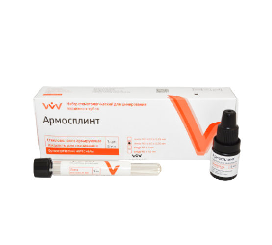 Стекловолоконная лента Армосплинт (90 мм × 3 мм × 0,25 мм) от ВладМива - высокопрочный материал для стоматологических конструкций. Состоит из стекловолоконных нитей в полиэфирной оплетке, силанизирован для надежной адгезии с композитом. Гибкость, влагоустойчивость и прозрачность обеспечивает эстетичность и прочность.